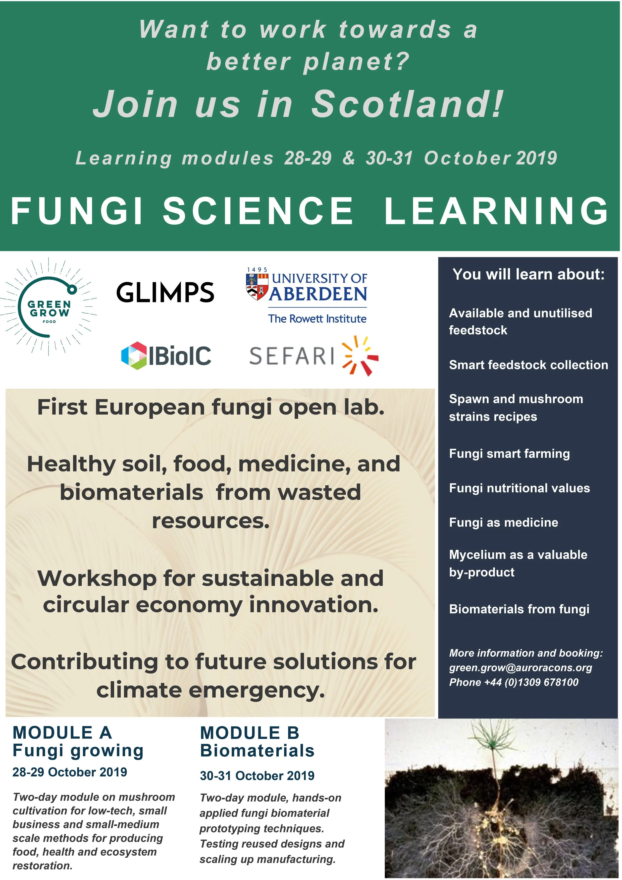 IBioIC is delighted to be supporting and presenting at this innovative open lab concept workshop developed by Green Grow Club, with Belgian biodesign agency Glimps and Rowett Institute, University of Aberdeen, and also supported by SEFARI. Comprised of two modules over two days each, these workshops are aimed at anyone with an interest in sustainable solutions and circular economy projects involving fungi.