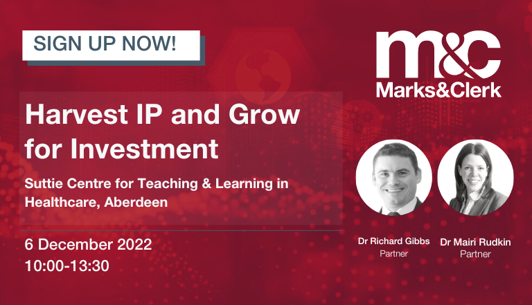 Marks & Clerk is proud to present our Harvest IP and Grow for Investment workshop at the Suttie Centre for Teaching & Learning in Healthcare, Aberdeen on December 6th.