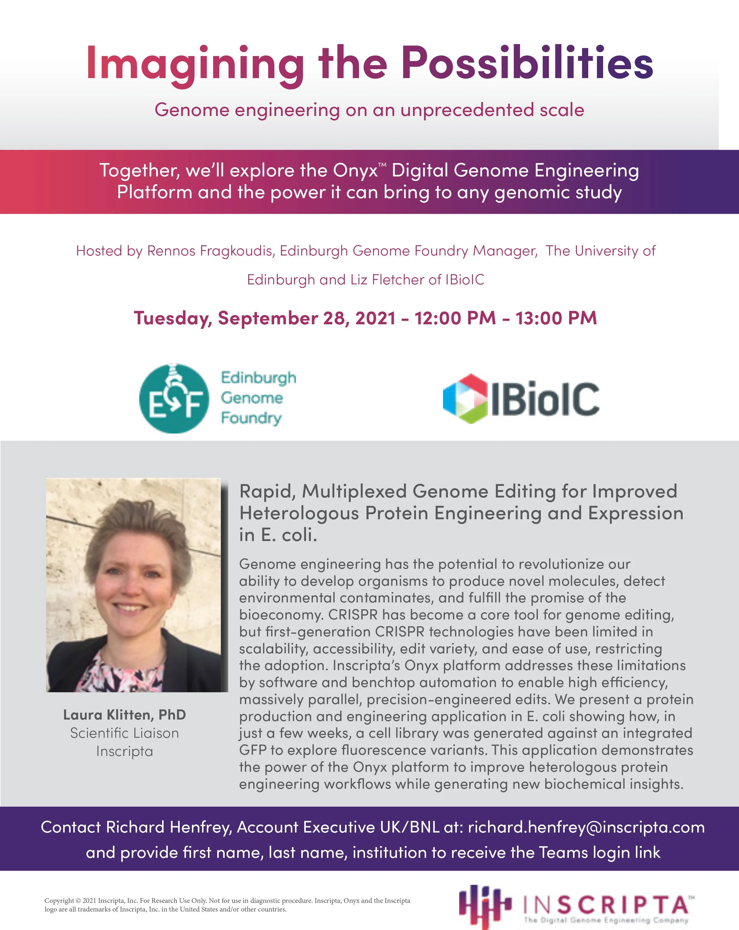 Contact Richard Henfrey, Account Executive UK/BNL at: richard.henfrey@inscripta.com and provide first name, last name, institution to receive the Teams login link