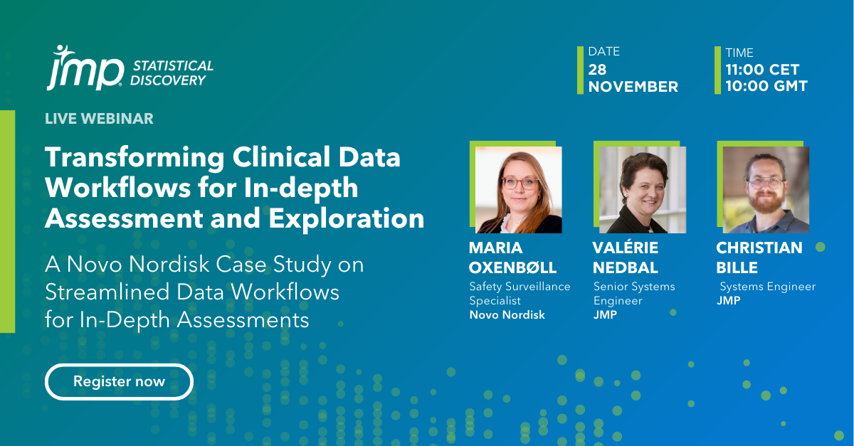 Join JMP for a webinar where Maria Oxenbøll, Safety Surveillance Specialist at Novo Nordisk, sheds light on the significance of improved data workflows and the role of advanced tools like JMP® Clinical in shaping the future of clinical drug development.