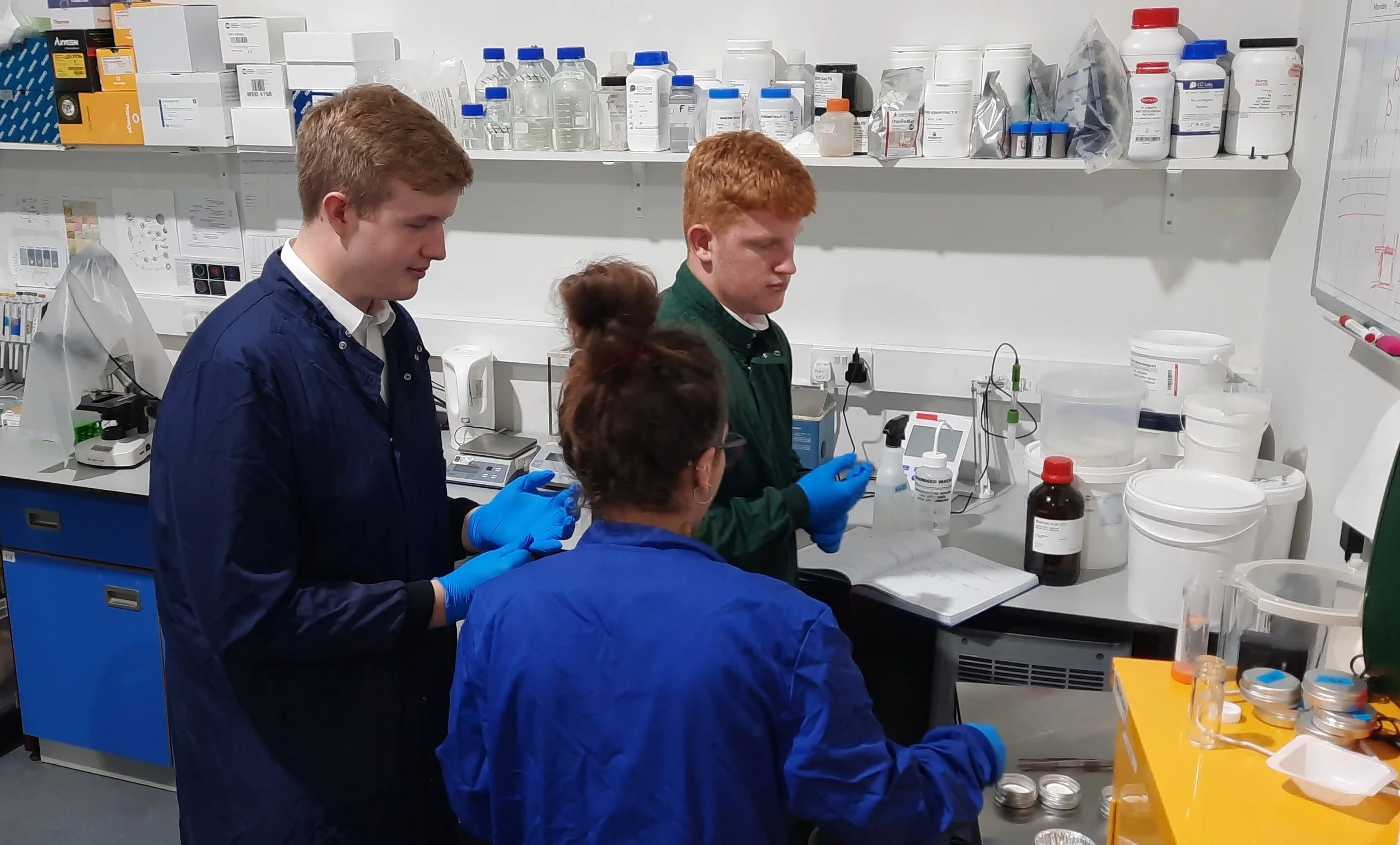 Foundational Apprentices James Blakely and Jason Talac weighing product samples with R&D Technician Julia Franco-Lluch