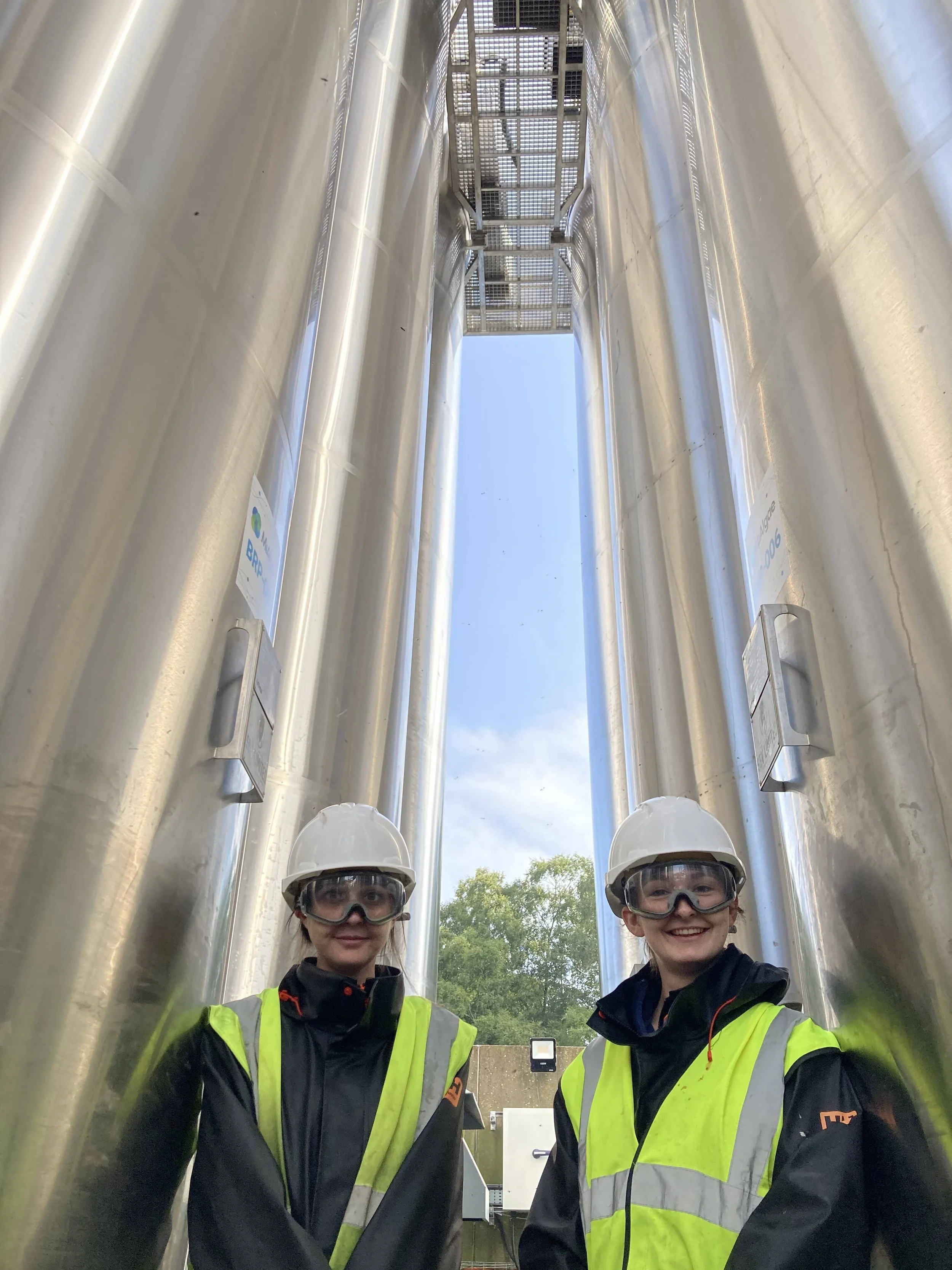 PhDs Iseabail Farquhar and Charlotte Lee at MiAlgae’s production site at Balfron