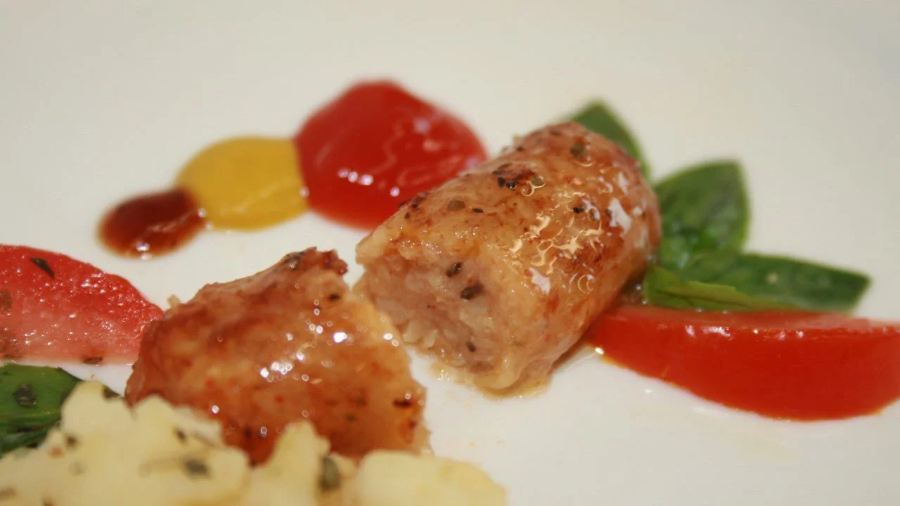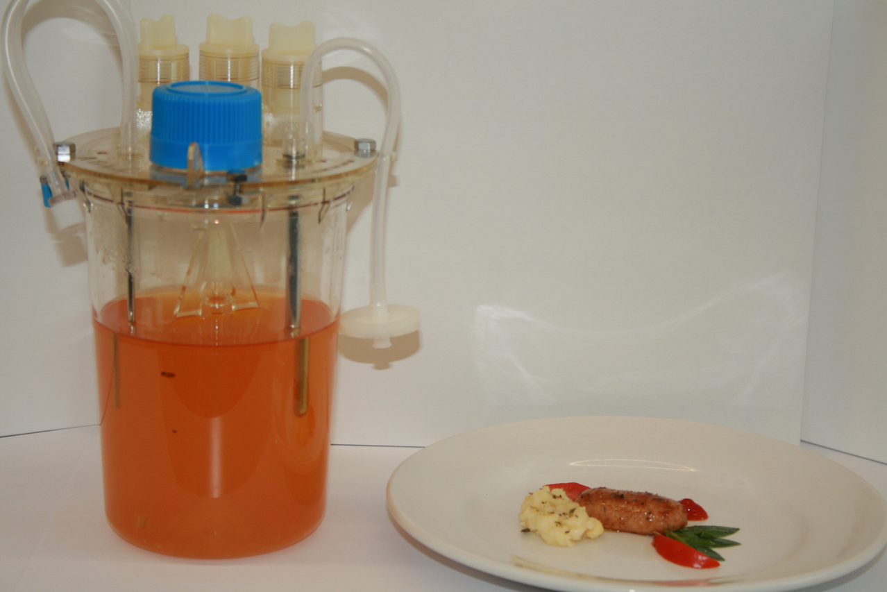 Elena started working with 500 mL bioreactors to assess media composition (to reduce the cost and find alternatives to animal components) and optimum growth conditions for undifferentiated cells. Since then, she has created initial prototypes using Roslin Tech’s porcine iPS cells. The first two produced, a sausage and a dumpling, contain 10-20% cultivated pig cells along with other plant-based ingredients (see images below).